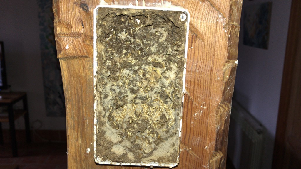 a) Inyección: Este sistema consiste en la creación de una barrera insecticida de alto poder residual en el subsuelo o en los marcos de las puertas de la instalación a proteger. Para crear dicha barrera, se procede a realizar una serie de taladros en todo el perímetro del marco retirando previamente el tapajuntas, realizando una perforación cada 20 cms, a lo largo del bastidor, colocando una válvula de no retorno e inyectando el producto insecticida al interior produciendo unas bolsas de producto que protegen al elemento de madera y que se garantiza por 5 años.